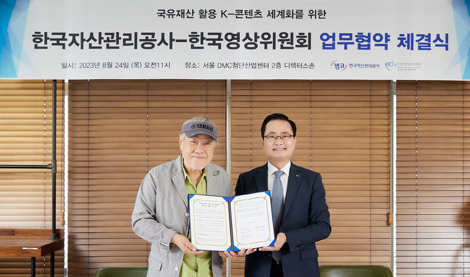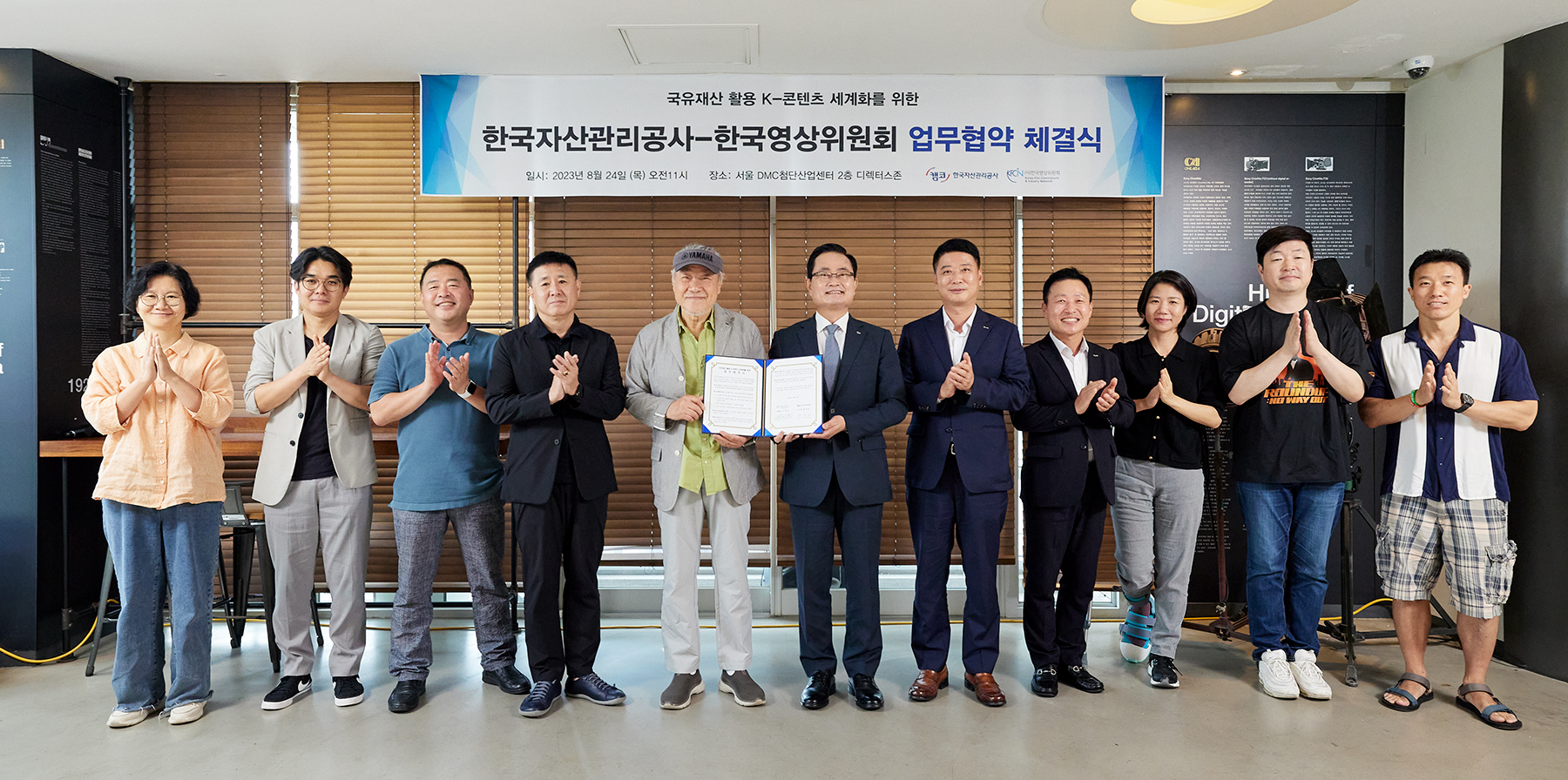 ()한국영상위원회는 824일 오전 11시 서울 DMC첨단산업센터 C2층 디렉터스존에서 이장호 한국영상위원회 위원장, 권남주 한국자산관리공사 사장 등 양 기관 관계자 및 지역 영상위원회 관계자들이 참석한 가운데 국유재산 활용 K-콘텐츠의 세계화를 위한 업무협약체결식을 가졌다.